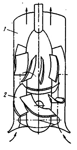 В осевых насосах поток жидкости движется через рабочее колесо в направлении его оси, т.е. параллелен оси вращения и перемещается в поле действия гидродинамических сил, возникающих при взаимодействии потока и лопастного колеса (рисунок 2.91).