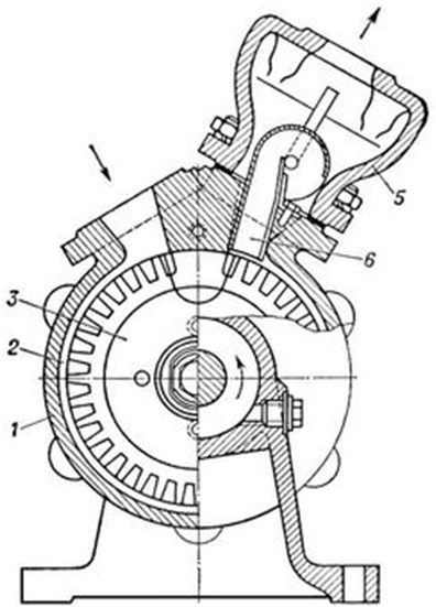 | 1 – корпус; 2 – ротор Рисунок 2.91 – Схема осевого насоса | 1 – корпус; 2 – канал; 3 – рабочее колесо; 4 и 6 – отверстия для подвода и отвода жидкости; 5 – воздухоотделитель Рисунок 2.92 – Вихревой насос закрытого типа |