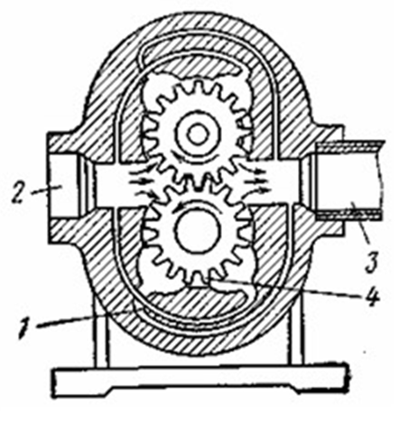 1 – разгрузочные канавки; 2 – всасывающее отверстие; 3 – напорный патрубок; 4 – ведущая шестерня