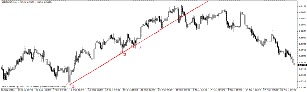 -Если тренд восходящий, то трендовая линия проводится по двум минимумам (низам) – линия тренда в этом случае называется поддержкой – эта линия не дает цене упасть.
