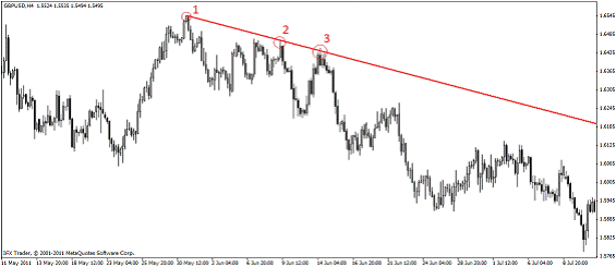 -Если тренд нисходящий, то трендовая линия проводится по двум максимумам (верхам) – линия тренда в этом случае называется сопротивлением – эта линия не дает цене подняться.