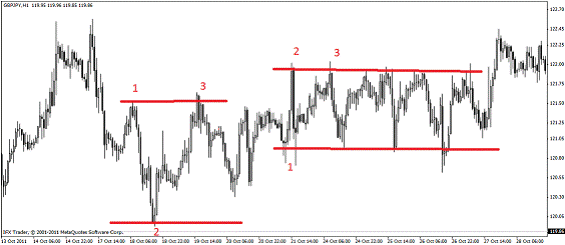 - Если тренд боковой, то горизонтальные уровни строятся по трем точкам, верхний уровень, сопротивление – этот уровень не дает цене подняться, нижний уровень, поддержка – этот уровень не дает цене упасть.