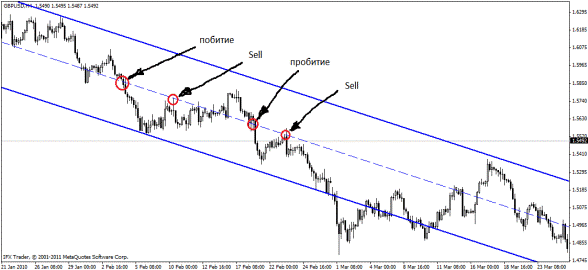 2) Когда цена из верхнего канала переходит в нижний или наоборот (пробивает канал: истинное пробитие – закрытие трех свечей ниже или выше пробитой линии!!!), то при возвращении к пробитой серединной линии открываем позицию (в направлении тренда).