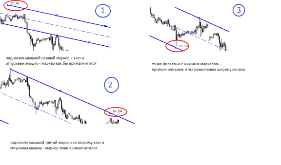 На рисунках показано, как точно по экстремумам (хаям или лоу) строить канал: