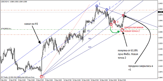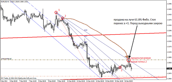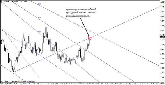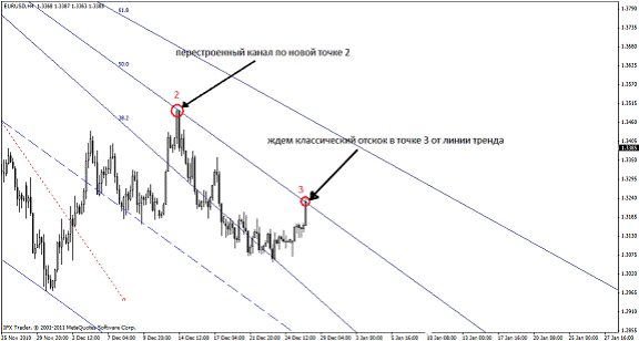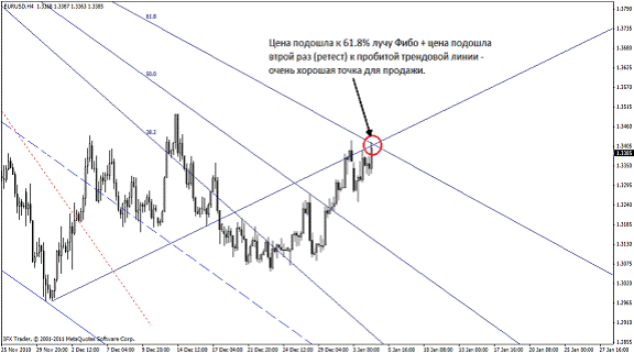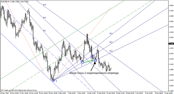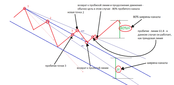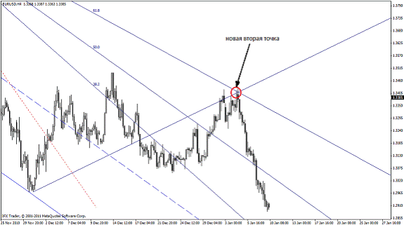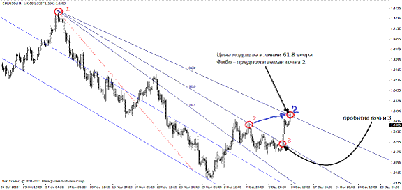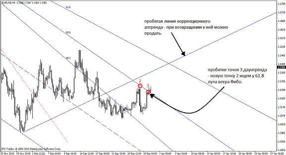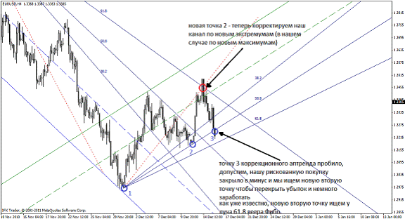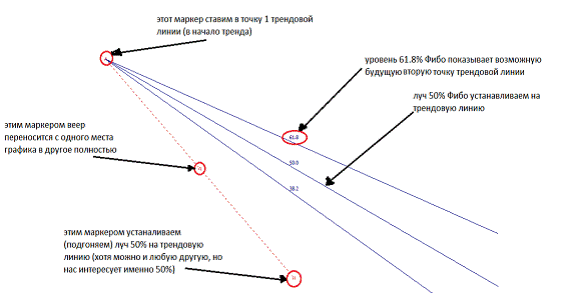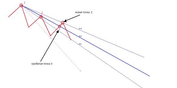 В нахождении будущей второй точки нам поможет веер Фибоначчи (в метатрейдере находится Вставка – Фибоначчи – Веер). Веер состоит из трех линии, равняющихся числам Фибоначчи – 38,2; 50,0; 61,8: Так вот, луч 61,8 Фибо показывает будущую вторую точку трендовой линии. Новая точка 2 образуется при соприкосновении цены и линии 61,8, если луч 50% веера Фибо совместить с линией тренда.