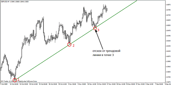Все мы знаем, что существует два основных вида анализа рынка форекс (да и любых финансовых рынков вообще) – это технический и фундаментальный. И здесь часто возникает закономерный вопрос – каким видом анализа пользоваться??? Если судить по легкости, то технический анализ проще фундаментального. Проще в плане объема нужной для анализа информации – не надо запоминать множество экономических данных и пытаться растолковать и связать их воедино; однозначности сигналов – если осциллятор в зоне перепроданности – то только покупать, если мы у поддержки – покупка на отскоке или продажа при пробитии- одним словом, четкие критерии. Да! Используя только технический анализ и не анализируя экономические данные (откинув фундамент вообще), многие трейдеры зарабатывают деньги. А зачем вообще пользоваться фундаментальным анализом??? Вспомним, чем занимается технический анализ – анализирует прошлое движение цены и на основании этого анализа делает вывод о будущем движении цены. Сейчас покажу на примере: пусть на тестере стратегий мы тестировали ситуацию, когда строим трендовую линию по двум точкам, а в точке 3 ждем: 1) Отскок от линии тренда (план «А»). 2) Пробитие, откат к пробитой линии и продолжении движения (план «Б»).