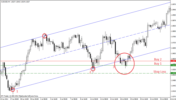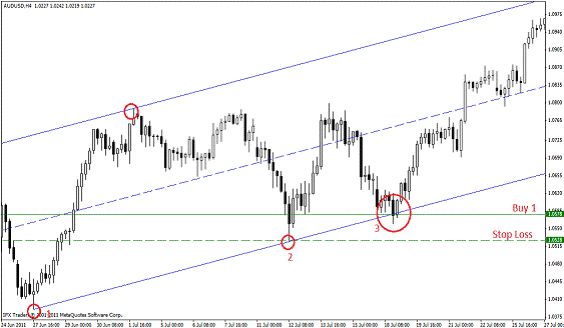 Здесь я построил канал по теням (хаям, лоу). Также я отметил, где я открою позицию на (Buy 1), в данном случае покупка и поставлю стоп. Не забыли – покупка или продажа при касании ценой линии тренда. А теперь посмотрите на картинку ниже: