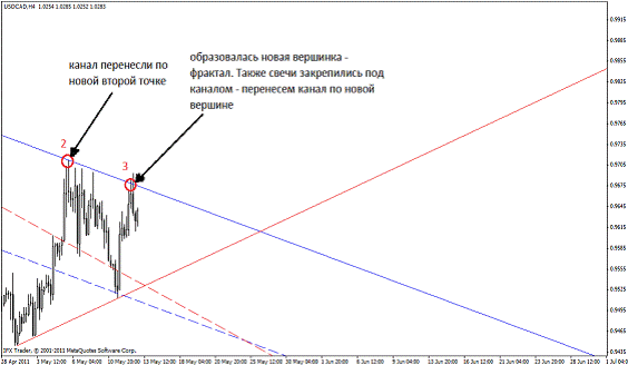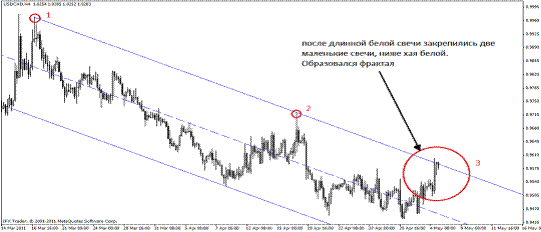 На рисунке сверху построен канал и в точке 3 даунтренда образовался фрактал. Сам фрактал, как таковой, обычно не нужен. Но! Посмотрите на последнюю медвежью свечу справа – она закрылась в области канала! Так же видно, что образовалась вершинка – фрактал. По нему можно перестроить канал. О чем в данном случае сигнализирует фрактал??? Только о том, что границы ценового канала расширились.