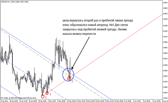На рисунке я пунктирной линией оставил самый первый канал. Условно я прежнюю точку 2 назвал «старой». После пробития точки 3 происходит откат к пробитой линии тренда и продолжение движения (смена тренда). Идем далее: