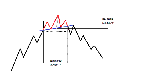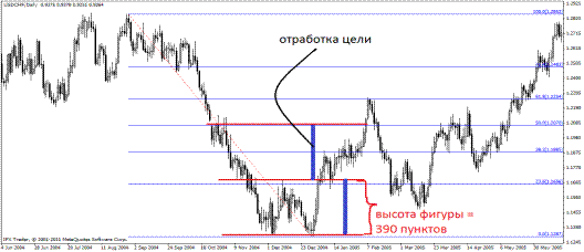 Теперь посмотри, как отработалась фигура. Цель (профит) – это высота фигуры (высоту я показал синей, жирной, вертикальной линией).