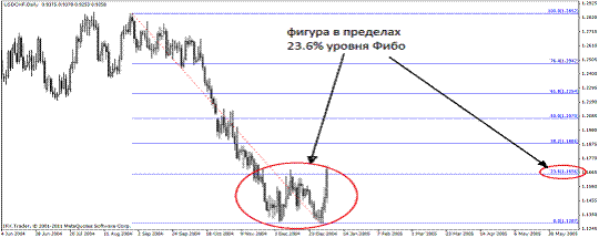 4) На этот пунктик обратите особое внимание!!! В учебниках, да и на курсах, про это положение почему-то не рассказывают. Так вот, переломная модель должна быть в пределах 23.6% или 38.2% уровня Фибо. Одним словом, фигура должна занимать не более 1/3 тренда (не должна быть больше 1/3 всего тренда).