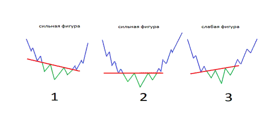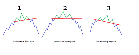 Также важно помнить о наклоне линии шеи. Если линия шеи направлена параллельно предшествующему тренду, то есть "смотрит" туда же, куда и тренд (на рисунке это фигуры 1 и 2), то эта фигура является сильнее, чем та, у которой линия шеи направлена ("смотрит") против предшествующего тренда (на рисунке это фигура 3).