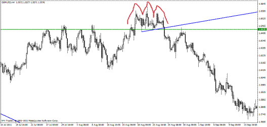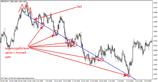 Я торгую вторым вариантом. Почему? Вероятность исполнения любой фигуры – 50 на 50. Поэтому, часто пробив линию шеи, она возвращается обратно и "ломает" фигуру. Фигура становиться ложной.