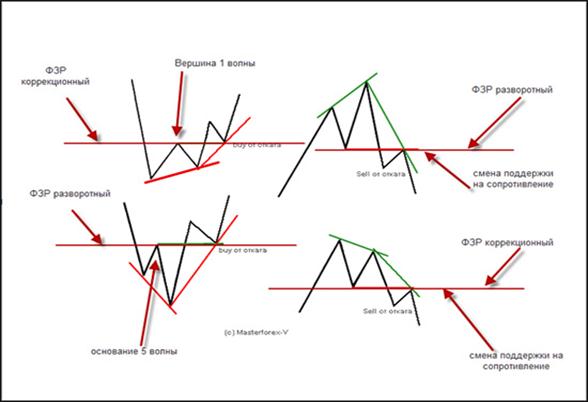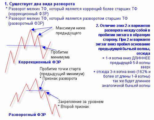 При коррекционном ФЗР происходит формирование 1 и 2 волн в противоположном от предыдущего направления движения, а затем пробитие вершины 1 волны и закрепление за ней. Длительность предстоящего движения можно прогнозировать исходя из того,на каком тайм фрейме произошел ФЗР: М5 и М15- краткосрочный тренд, Н1 и Н4 - среднесрочный тренд.