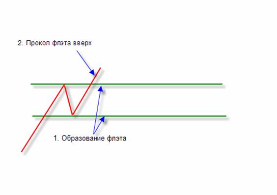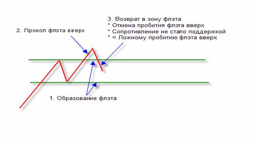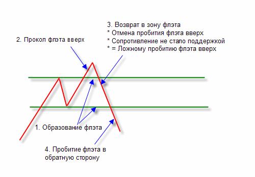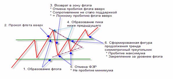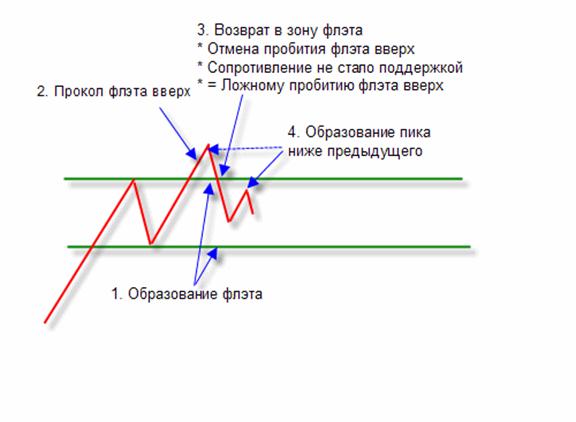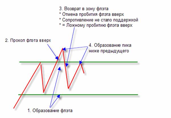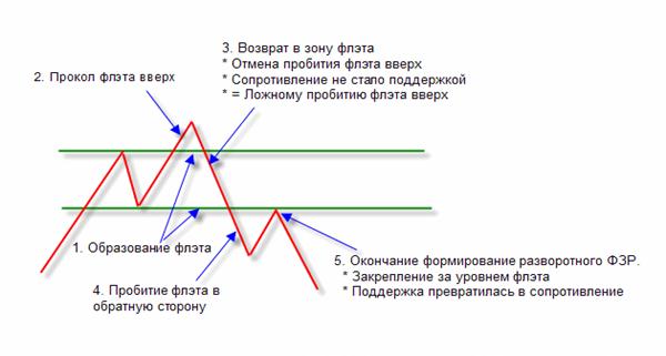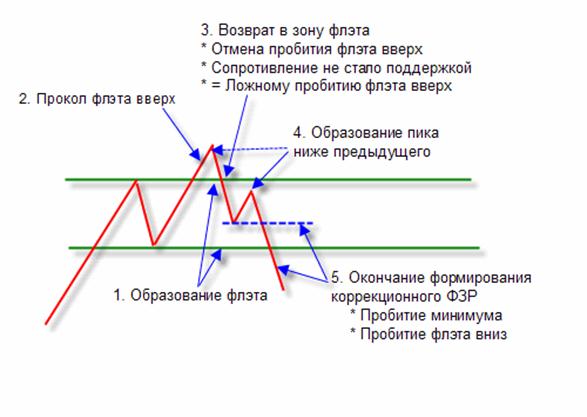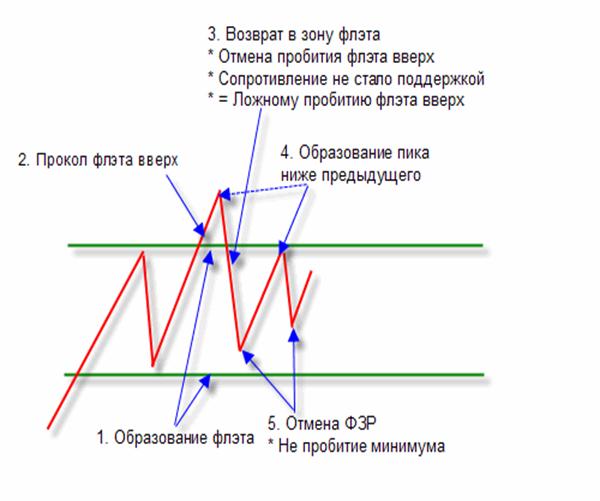 Есть еще один вид ФЗР без ложного пробития флэта (двойная или тройная вершина/дно). Ниже приведен пример формирования ФЗР вниз.