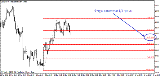 Не забывем, что фигура разворота должна занимать 1/3 тренда, то есть не выходить за 38.2% уровень Фибо. Наносим сетку на график: