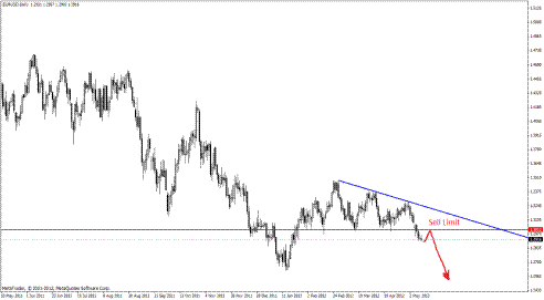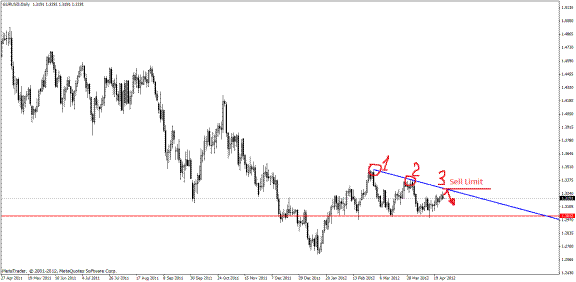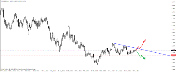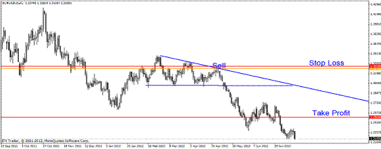 Пример 4. EUR/USD, дневной график, 24.02-23.04.2012 год, рисуется нисходящий треугольник, поэтому при пробитии одной из сторон на откате входим в сделку: