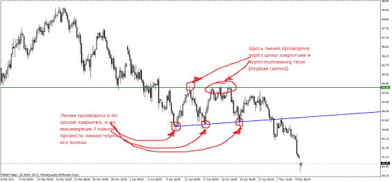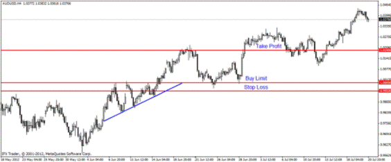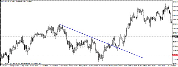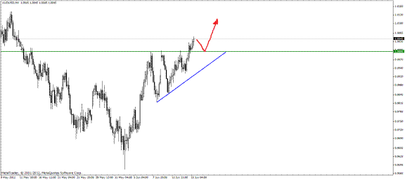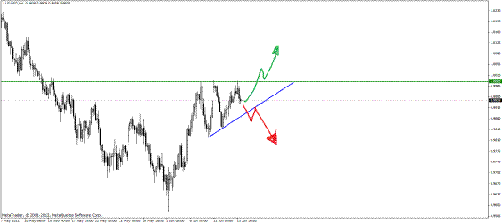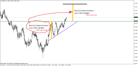 Пример 6. AUD/USD, четырехчасовик, 07-14.06.2012 год. Формируется восходящий треугольник. Как обчно, при пробитии одной из сторон, входим в сделку: