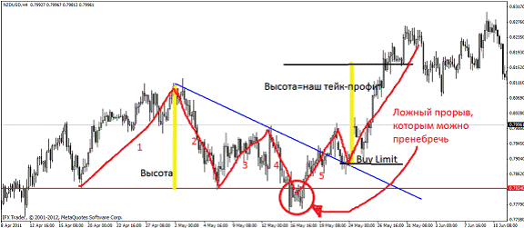 Цена пробила верхнюю сторону треугольника, поэтому на откате будем покупать пару. Цель нашей покупки – 190 пунктов. Я, надеюсь, вы не забыли, что цель нашей покупки – это высота треугольника???: