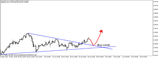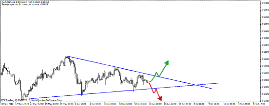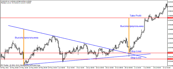 Пример 6. CAD/CHF, четырехчасовик, 18.05-21.06.2012 год. Формируется обычный треугольник и, как обычно, при пробитии одной из сторон на откате входим в сделку: