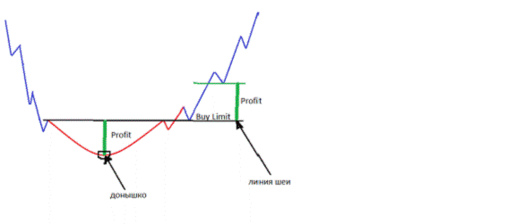 Ну, впрочем, смахивают на блюдца. Как вы увидели, закругленная вершина / основание являются разворотными фигурами. Посмотрите на одну особенность – тренд переходит от роста к падению постепенно, не скачками, ступеньками, а именно плавно. В чем сложность этой модели - это определение донышка / вершинки блюдца, которое нам нужно для открытия сделок. Но, сделки можно открывать и при пробитии на откате к линии шеи. В этом случае профит – это расстояние от донышка / вершинки до линии шеи. Подробнее на картинке: