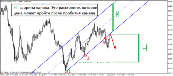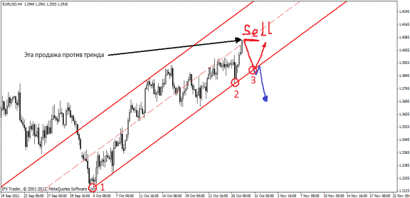 Покупать мы будем в точке 3 поддержки канала (красная стрелочка). При пробитии точки 3 на откате будем продавать (синяя стрелочка). Все по классике! Но посмотрите, ведь понятно, что продажа в середине восходящего канала – это довольно рискованно (отмечено Sell). Это – торговля против тренда.