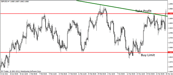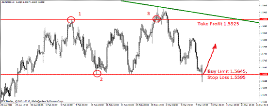 Цена у нижней границы флета, поэтому логично будет покупать. Уровни покупки, тейка и стопа отмечены на картинке. Кстати, дата 12.03.2012: