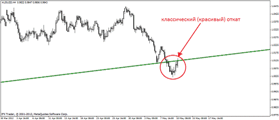 Пробивает линию тренда (три свечи закрепилось за пробитой линией) и посмотрите, как откатывается цена к пробитому тренду - это и есть красивый откат: