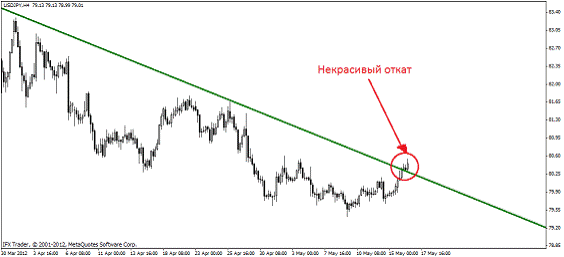 Пробивает линию тренда (три свечи закрепилось за пробитой линией) и посмотрите, как откатывается цена к пробитому тренду - это и есть некрасивый откат:
