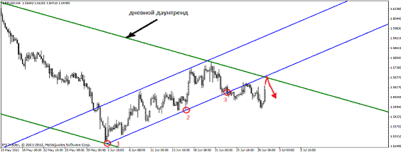 Четырехчасовой график – по классике после пробития точки 3 аптренда на откате продаем: