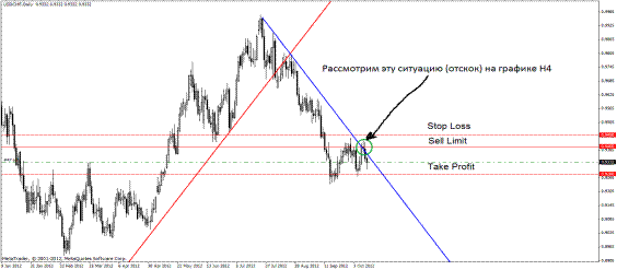 Произошел отскок от пробитого дневного даунтренда. На Н4 мы можем только выставить точную точку входа: