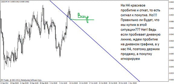 Как видим, наша покупка принесла бы нам стоп. Поэтому, если линия с дневного графика – пробитие и откат ждем только на дневном, если с Н4 – только на Н4. Далее – все по классике: или отскок, или пробитие с откатом.