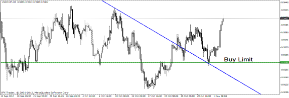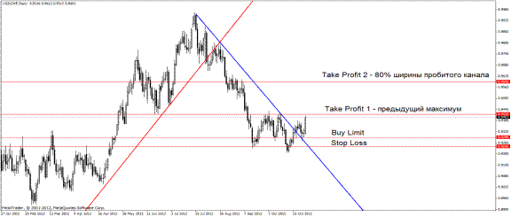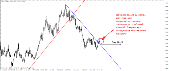 Цена пробила дневной даунтренд, три свечи закрепились за пробитой линией, поэтому закрываем продажу (лично у меня у одного брокера цена не дошла до стопа 2 пункта, у второго – закрылась по стопу) и выставляем отложенный ордер на покупку: