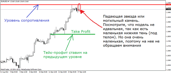 А вот у надгробного камня тела нет совсем – цена открытия близка или равняется цене закрытия. Кстати, надгробие – это разновидность доджей. Про нижнюю тень отвечу – ее не должно быть или она есть, но очень маленькая. Хотя на примерах вы визуально увидите эти свечи – тогда все станет вам понятно. Да и запоминаются различные виды японских свечей на практике намного быстрее. Да и еще, цвет тела – черный или белый – у тела свечи, не имеет решающего значения, хотя черный цвет все же лучшее. Черный цвет – медвежий цвет, как – никак. Свечи я рассматриваю только в паре с графическим анализом, то есть просто – напросто смотрю, куда упирается тень падающей звезды, в какой тренд или уровень. На примерах все станет понятно. Пример 1. пара EUR / USD, график четырех часовой, 17.09.2012, 16:00. хвост падающей звезды уперся в уровень сопротивления. Тело свечи очень маленькое, а верхняя тень – длинная. Самое время продавать евро: