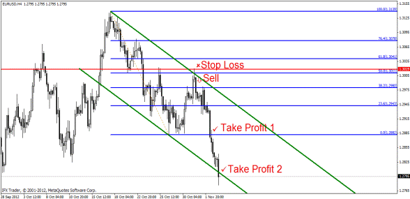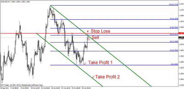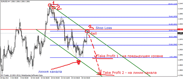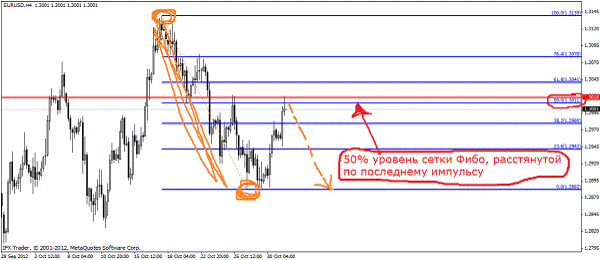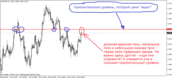 Как видим, наша падающая звезда еще и стала вторым «горбиком» разворотной модели «двойная вершина». Удачно продались. Пример 2. пара EUR / USD, четырехчасовой, 31.10.2012, 12:00. Наша, не совсем красивая, падающая звезда (некрасивая, потому – что у нее есть маленькая нижняя тень) уперлась в важный горизонтальный уровень сопротивления: