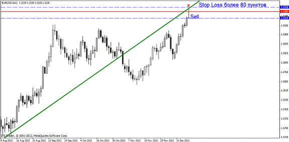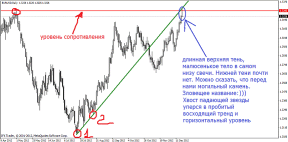 Ну вот. Цена дошла до первого профита и до второго. Вы уже заметили, что свечной анализ – это дополнительный сигнал к открытию сделки. Простое появление падающей звезды, если она не упирается в важные линии тренда, горизонтальные уровни для открытия продаж не рассматриваются. Запомните: нас всегда интересует, куда уперлась тень падающей звезды. Если она уперлась куда – то в небо, такую звезду пропускаем. Так, давайте теперь посмотрим на дневной график – здесь есть некоторые особенности торговли падающих звезд. А эти особенности мы и рассмотрим с вами в примерах. Пример3, пара EUR / USD, график дневной, 19.12.2012, 00:00. у нас образовался надгробие (могильный камень) на дневном графике, который уперся в пробитый аптренд и горизонтальный уровень сопротивления.