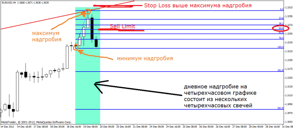 Я в своей системе использую стоп – лосс не более 50 пунктов, но что делать??? Отказаться от сделки??? Нет. Отказываться необязательно. Можно пойти другим путем. Находим середину нашего надгробия. Для этого на дневном или четырехчасовом графике растягиваем на надгробие сетку Фибо находим 50% уровень, который и показывает нам середину нашей свечи. И на середине свечи мы выставляем отложенный ордер на продажу Sell Limit.