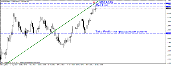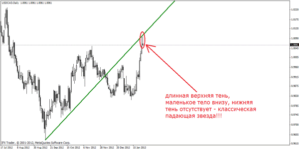 Здесь вы увидели еще один момент, когда следует все – таки зафиксировать прибыль, ведь трендовая линия – это сильное основание для закрытии позиций и открытия новых. Пример 4. пара USD / CAD, график дневной, 28.01.2013. 00:00. Цена подошлак пробитому ранее даунтренда, после чего нарисовала классическую падающую звезду.
