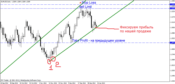 Так же замечу, что вход «по рынку» сразу, после образования падающей звезды, «слизал» бы наш стоп – лосс и ушел бы на юг (вниз) без нас. Но вот цена «тормознула» у дневного аптренда, поэтому будем закрывать нашу продажу по рынку: