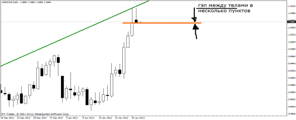 Но почему она идеально классическая??? Очень просто. По теории, тело падающей звезды и тело предыдущей свечи должны имеет разрыв между собой (по- народному, гэп). Разрыв – это не обязательно условие, но если он появляется – становится усиливающим фактором для падающей звезды. А вот и наша канадская падающая звезда с разрывом.
