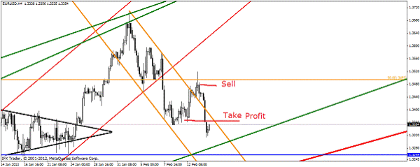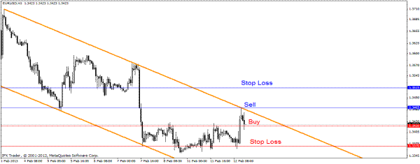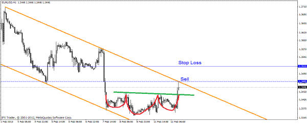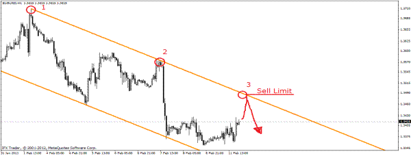 Как вы увидели, вовремя закрытая сделка на продажу спасла нас от убытков. Но здесь напрашивается очень интересный вариант торговли – торговля при неопределенности. Давайте посмотрим на часовой график. При откате к сопротивлению нисходящего канала в точке 3 продаем евро.