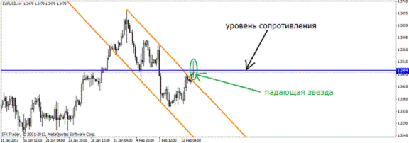 Когда у нас неопределенность, всегда можно воспользоваться положительным замком. Далее. Четырхчасовой график. Образовалась новая падающая звезда (кстати, вы не забыли условия, когда стоит трогать падающую звезду??? Она должна сформироваться не в пространстве, а упереться соей тенью в уровень или линию), которая уперлась хвостом (тенью) в уровень сопротивления.