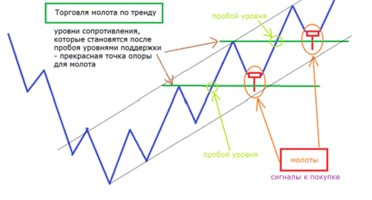 А теперь я вам напомню одно важное правило: сами по себе свечные модели (модели Price Action) не торгуются!!! Помните цитату Архимеда: «дайте мне точку опоры и я поверну землю!!!»??? Так и молоту – нужна точка опоры, чтобы повернуть нисходящий тренд на восходящий. Этой опорной точкой может быть горизонтальный уровень, границы флета, уровень Фибо, всевозможные трендовые линии и линии каналов, медианы и т.п. – то есть, те линии и уровни, которые цена «видит» (еще говорят, «уважает»). Самые лучшие результаты торговли с помощью молота приносит: