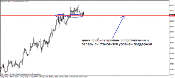Пример 1. пара USD / CAD, график четырех часовой, 29.05.2012, 08:00 (это не время входа в сделку, а время открытия четырех часовой свечи). На графике цена пробила уровень сопротивления. Тренд восходящий, поэтому ищем покупки: