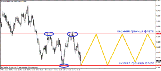Пример 2. пара NZD / USD, график четырех часовой, 22.03.2012, 16:00. на графике сформировался флет, и цена стремится к его нижней границе.