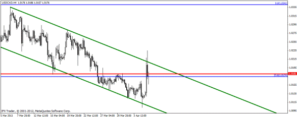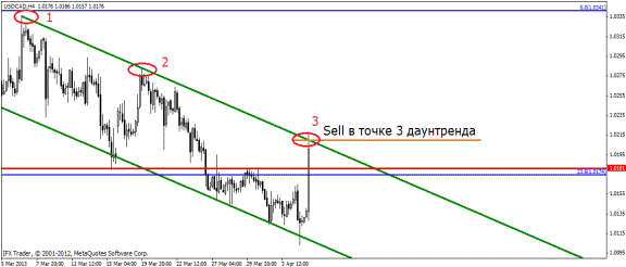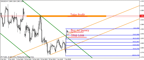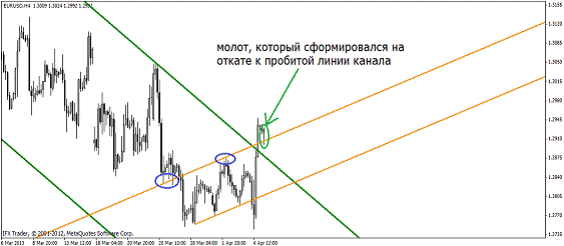 Пример 7. пара EUR / USD, график четырех часовой, 05.04.2013. 08:00. На графике у нас есть пробитая линия канала и возврат к ней. Так же мы видим, что возврат к этой линии ознаменовался формированием молота.