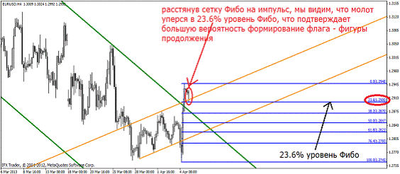 Если натянуть сетку Фибо на последний безоткатный импульс – мы увидим, что наш молот уперся в первый уровень Фибо 23,6%, что «говорит» нам о довольно неплохой вероятности формирования флага – фигуры продолжения (о том, что такое флаги, как их торговать, где искать и все, что с ними связано – поговорим будущих статьях).
