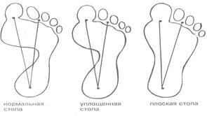 | Заключение о состоянии опорного свода стопы делается на основании анализа положения двух линий, проведённых на отпечатке. Первая линия соединяет середину пятки со вторым межпальцевым промежутком; вторая, проведённая из той же точки, проходит к середине основания большого пальца. Если контур отпечатка внутреннего края стопы в серединной части не перекрывает эти линии – стопа нормальная; если первая линия проходит внутри отпечатка – стопа уплощена; если обе линии расположены внутри отпечатка стопы – стопа плоская. | |||