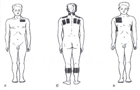 | Графическое, схематические и табличное представление технологий выполнения простой медицинской услуги:Области наложения горчичников
