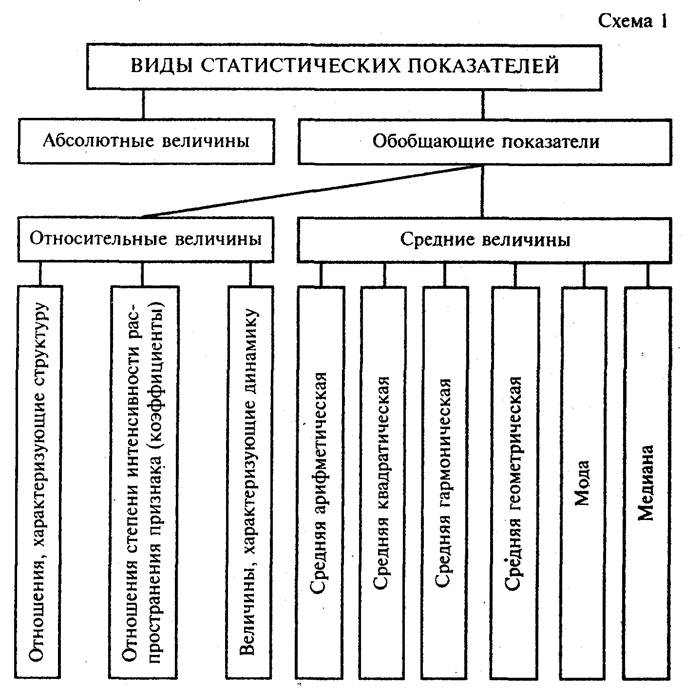 Абсолютные величины, приведенные в сравнимый вид, называются в статистике обобщающими показателями. Обобщающие показатели подразделяются на относительные и средние величины (показатели) — схема 1. Они дают сводную, общую количественную характеристику уровня явления или выражают связи и соотношения, а также динамику явления, характеризуют одним числом наиболее типичные, наиболее распространенные стороны массовых процессов.